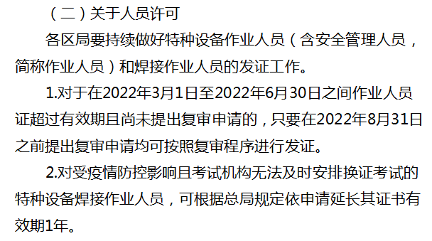 2.對(duì)受疫情防控影響且考試機(jī)構(gòu)無(wú)法及時(shí)安排換證考試的特種設(shè)備焊接作業(yè)人員,可根據(jù)總局規(guī)定依申請(qǐng)延長(zhǎng)其證書(shū)有效期1年。